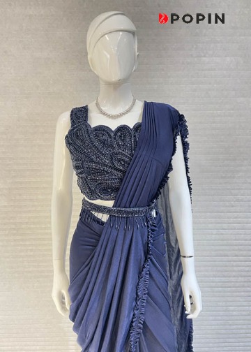 BLUE RUFFLE SAREE WITH EMBROIDERED BLOUSE